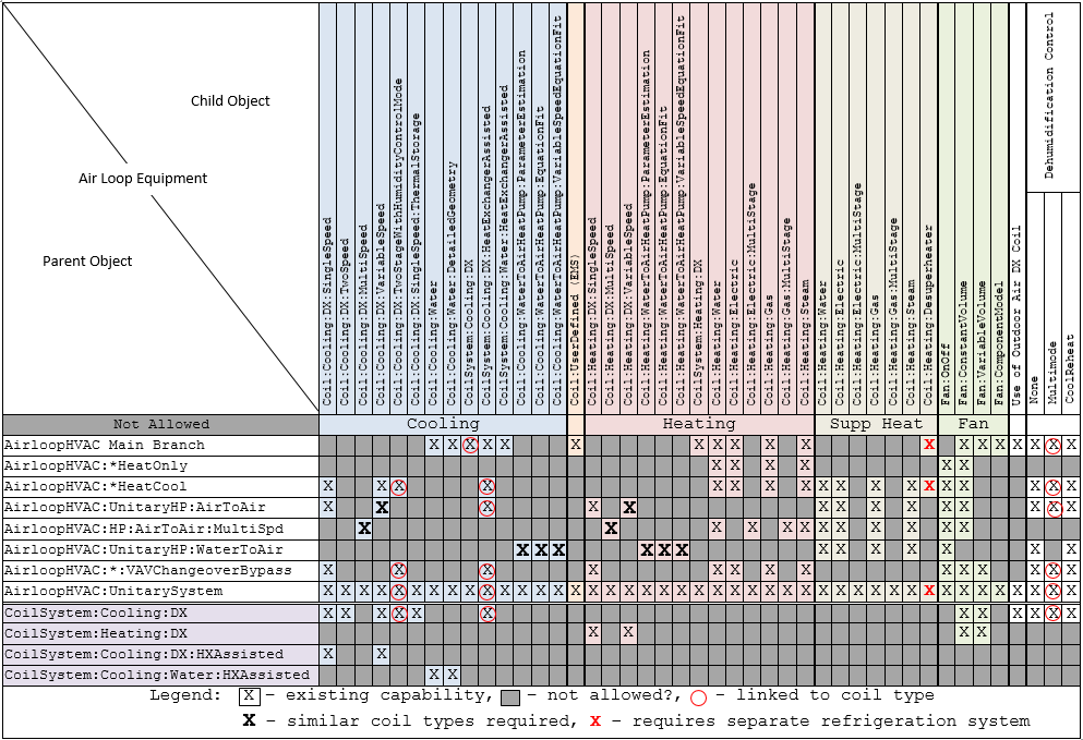 The following HVAC equipment types are allowed in the air loop. The component matrix shows which coils and fans are allowed with which equipment models.